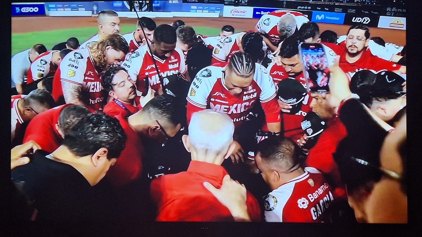 Pero además me es especial porque tuve oportunidad de desayunar una vez con el dueño del equipo, don Alfredo Harp Helú (en la foto, el hombre de cabello blanco que tiene una mano en el hombro; el equipo está arrodillado agradeciendo a Dios por su campeonato y el nonagenario personaje está con su equipo en el campo). Me dedicó su libro. Escuchó algunas ideas que tenía para el equipo y fue muy amable conmigo y con la institución anfitriona.