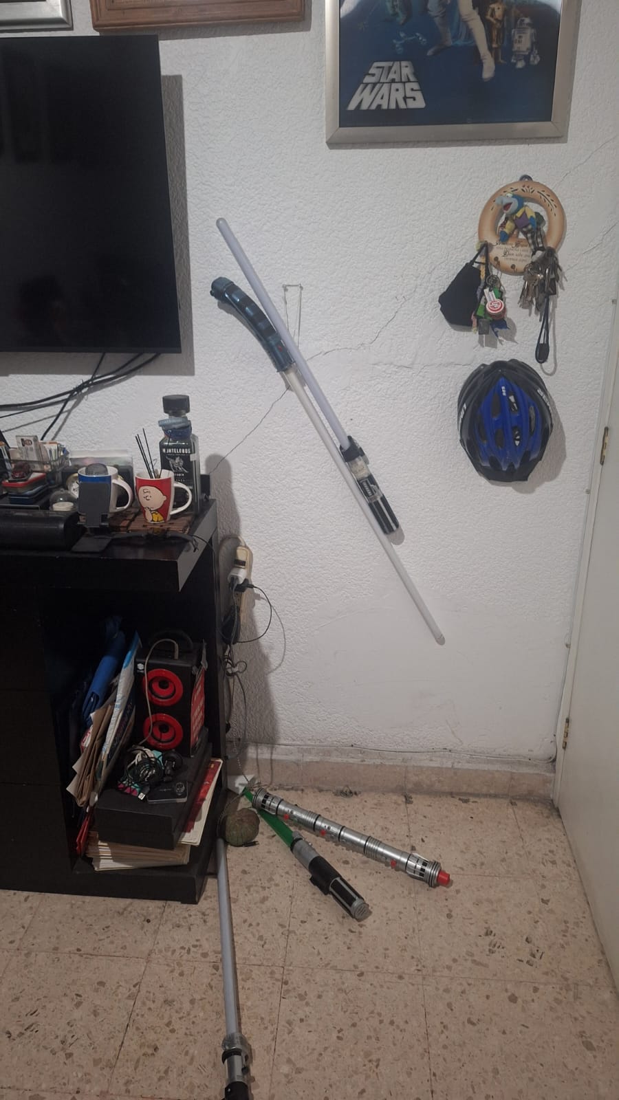 Acá en la casa, el único daño menor es que la colección de espadas de Star Wars se cayó de la pared o terminó desacomodada. Nada grave, aunque alguien me dijo que “es una pena que ni La Fuerza pudo ayudarlas a no caer”. La fractura en la pared ya estaba y no se hizo más grande. Es por un asentamiento del edificio de al lado.