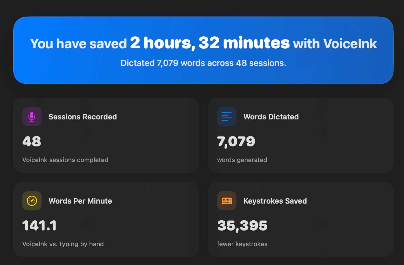 Debo señalar que, en las casi dos semanas que llevo usándolo, este software reporta que he ahorrado 2 horas y media de escritura en el teclado, lo cual me parece válido. Cabe destacar que, para hacer la comparación, utilicé también el reconocimiento de voz que viene nativo en el sistema operativo de Apple. Y creo que la principal diferencia radica en dos cosas.