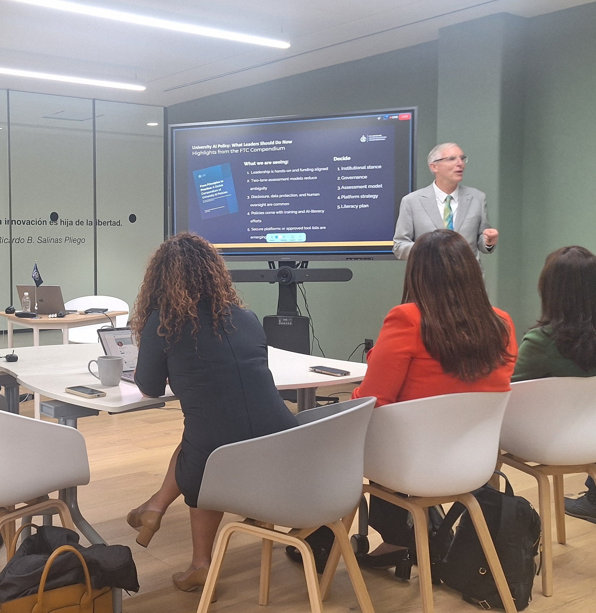 Asistí a dos talleres del profesor John Fischetti de la Universidad de Newcastle, Australia. En uno, abordamos las mejores prácticas de adopción de la A.I. en entornos universitarios. En otro, la discusión actual sobre la regulación legal adecuada.