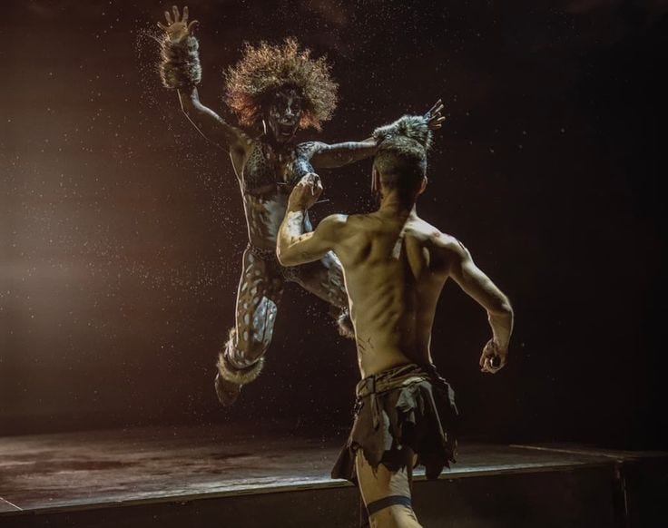 Por ejemplo, en la foto tenemos un jaguar atacando a uno de los correos de Moctezuma. Sí, así debían estar vestidos: a final de cuentas, eran corredores de fondo, que podían cubrir con relevos la ruta Veracruz-México, de más de 400 kilómetros, en menos de 24 horas. Entre más ligeros, corren mejor. Y bueno, que el jaguar parezca salido de El Rey León… tiene que ver con la estética teatral aceptada en estos tiempos.